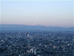 数分ですっかり太陽は昇りきったが、後ろに並んでいる人たちが、やはりどうしても前の方で写真を撮りたいということで、どんどん前に詰めてくるために、しばらくごった返していた。その一方、南〜西側は、ほとんど誰もおらず、同じ場所とは思えない様相だった。そして南側をよく見ると柵越しに富士山がよく見えた。 |