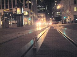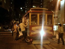 サンフランシスコは、ちょっと見かけただけでも、通常のバスはもちろん、地下鉄、路面電車、トロリーバス、そしてケーブルカーと、かなり多種多様な交通機関が縦横無尽に走り回っている。遅い時間にはなってしまったけど、ケーブルカーに乗ることにした。折り返し場所(停留所?これも電停かな?)にくると、交差点を挟んだ向かい側にケーブルカーが止まっていた。ヘッドライトをつけてはいるけど、誰も乗っていない。もう運行が終わってしまったのかと心配になったが、このくらいの時間(午後8時くらい)になると、20分おきくらいの頻度で運行されるらしい。つまり、道路の向こうにたたずんでいるのは、時間調整しているだけのようだ。停留所(電停)ではなく、なぜか道路の真ん中に停車しているのかよくわからないけど。都電と同じように、チンチンという鐘を鳴らして、おもむろにこちらにやってきた。車両は、オープンデッキの部分と、客車になっている部分と分かれている。デッキから直接乗り込むんで、車掌に運賃を支払う。3ドル均一らしいが、若干高い気がする。