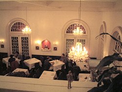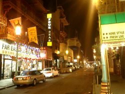 チャイナタウンは、サンフランシスコでも有名な場所のひとつらしい。言われてから、そういえば…と気づいた。着いた時間が遅かったせいもあって、人通りはまばらだったが、中華街の独特な雰囲気を味わうことができた。比較する対象が横浜の中華街くらいしかないけれど、呼び込みをするおばちゃんや並ぶお店も横浜とそっくり。でも全体的に違うと感じたのは、みんな歴史を感じさせる建物ばかりだったからかもしれない。入ったお店の中もそんな感じ。天井からはシャンデリアが下がり、アーチ型の窓から見える景色は、異国情緒を感じさせるには十分だった。 |