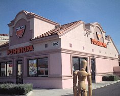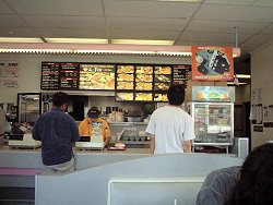 | 一番よく見かけた日本語は、道路沿いのお店のメニューだろうか? SUSHi(寿司)の文字。この地の食生活にとけ込んでいるのかもしれない。 吉野家にも行った。前の晩に閉まっていたということもあって、そのリベンジということで翌日も行くことになった。メニューは、レギュラーと、ラージサイズが選べる。レギュラーサイズとはいえ、とても大きく、肉の量は日本の特盛りと同じくらいあった。ラージサイズに至っては、巨大な弁当箱のような感じで、優に2〜3人前といった感じだった。さらに、セットメニューというのもあって、サラダに加えて、なぜかプリンやケーキ、飲み物の選択肢にはコーラなどもあり、ファーストフードそのものだったのが印象的だった。また、「吉野家」と書かれたTシャツや湯飲みなどがお土産として売られていた。アメリカ人にとって、漢字のイメージが、ブランドの「ロゴマーク」として見えるのだろうけど…。