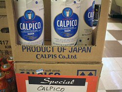 日本の食品も取り扱っているスーパーにて。 たくさんの食品に混じって、日本でもよく見かけるラベルを見つけた。カルピス…えっ、カルピコ?? なんだよ、コピー商品かよ…なんて思ってよく見てみると、PRODUCT OF JAPAN。製造元はカルピスとある。 どうやら、こちらのブランドらしい。あえて変えてあるのには、何か理由があるのだろうけれど…と思って調べてみたら、「カウ(牛)」の「ピス(おしっこ)」に間違えられる可能性があるとのことで、変えられたらしい。 |