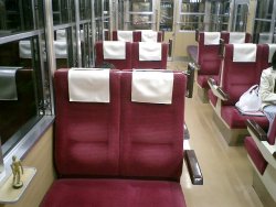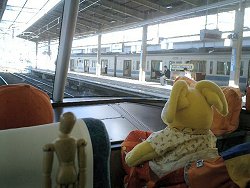 前回座った席には、なにやらダミーのライバルにしては巨大すぎる人形が陣取っていた。朝早い出発だったこともあり、町田を出るあたりから、おじゃこは寝てしまった。 |