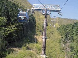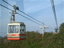 この新しいロープウェーは「フニテル」と呼ばれている。正式には「複式単線自動循環式普通索道」というらしい。これまでのロープウェーは一本のケーブルにぶら下がっているが、このフニテルは2本のケーブルにぶら下がっているので風に強い。「フニテル」とはフランス語の造語らしい。床と天井以外はガラス張りで、高所恐怖症の人には少々怖いかもしれない。ただ搬器(お客さんが乗るところ)が、以前のものに比べて大きくなったので、安定感が増した感じなので、そんなに心配はいらないか。