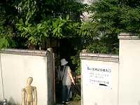深川江戸資料館から歩くと十数分くらいかかるだろうか。清洲橋を横に見ながら、萬年橋という橋を渡ると、左側に小さな公園のような広場があって、これが分館史跡展望庭園となっている。芭蕉の像があったらしいが、よくわからないまま、そこを跡にして、堤防沿いを記念館に向かって歩く。入口がどこにあるのかわからない…なんて思いながら歩いていくと、まさしく”裏口”のような入口があった(写真右)。