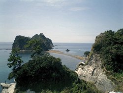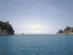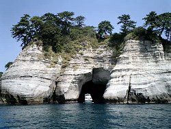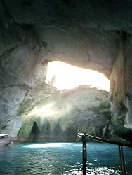 さて、ここ堂ヶ島の一番の見どころは、やはりなんと言っても海の洞窟で、最大のクライマックスが洞窟の天井の一部がくり抜かれたような天窓洞(てんそうどう)だ。国の天然記念物にも指定されている。洞窟めぐりの遊覧船は5分〜10分おきに運行されていて、ほとんど待たずに乗れる。大人920円。一番前の席に陣取って、風景を楽しむ。なかなか洞窟の方には行かない。一番の見どころなので、やはり一番最後だ。15分くらいして洞窟の前に来た。先に洞窟の中に入っている遊覧船が出てくるのを待つ。自分たちの乗る船の横を通り過ぎたのを見計らって、長い汽笛を何回か鳴らしいよいよ洞窟の中へ。同じ船に乗っていた観光客が思わず口にした「ディズニーランドのアトラクションみたい!」という言葉がぴったりくるような、確かにすばらしい光景だった。天気がよいせいで太陽の光が、ぽっかりと空いた天井から海まで降り注ぎ、海面がエメラルドグリーンに輝いていた。もっと眺めていたかったが、無情にも遊覧船は天窓洞をあとにする。