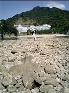 続いて「トンボロ」という珍しい現象を見に行く。遊覧船の乗り場から歩いて数分くらいのところ。干潮時に島まで歩いて渡れるくらいの道というか磯が出現する。干潮時に必ず現れるというものでもないみたいで、干潮時の海面の高さによって、出たり出なかったりするらしい。今は、まさにこの時間が出現する干潮時間だったので、急いで現場に向かう。遊覧船からもちょっと見えていたが、すでにトンボロ現象が起きていて、島までの一本の道ができていた。勝手に「砂浜」がつながっているようなイメージでいたのだが、実際には丸い石がごろごろしていて、かなり歩きにくい。この丸い石と石との間や、石の下にはたくさんの海の動物が住んでいる。ここはヤドカリはもちろん、カニやウニ、なまこ?など文字通り生きた理科教材でいっぱいといった感じだ。つながった先の島は、三四郎島と呼ばれている。3つの島なのに海から見ると4つに見えることからその名が付いたとのことだが、さっき乗った遊覧船からは確認ができなかった。先の島まで渡ろうと思ったのだが、どうも干潮の時間は終わりかけていたようで、島と島を結ぶ道が狭くなってきたため、残念ながら隣の島までは渡れなかった。磯の動物たちを観察しながら、もと来た道を引き返した。