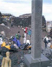 せっかく苦労して登ってきたのに、下りるのはもったいない気もしたが、下りないわけにもいかないので、下山を開始することにする。 須走口の山頂にあった鳥居が、電通の奉納によるものだったが、ここの下山口と書かれた石碑も、電通が作ったものだった。どうも電通と富士山との関係は、ただならぬモノがあるような気がする。 |