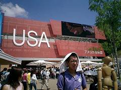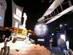 そう言えば、入館前のチェックの厳しさもアメリカ館ならでは?といったところかもしれない。金属探知器と手荷物検査を受けて館内に入る。最初のコーナーでは、ベンジャミン・フランクリンの像が出迎えてくれる。映像を楽しんだあとは、アメリカの実力をまざまざと見せつける展示と続く。もうずいぶん昔に行った、ワシントンD.C.にあるスミソニアン博物館を思い出させた。