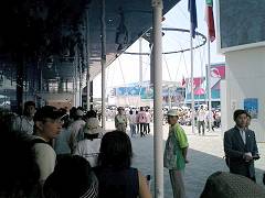 携帯電話で待ち時間の一覧が見られるサービスは、とてもありがたかった。ただ目安ということもあるのか、2日目に行ってみた韓国館は、表示では30分となっていたが、実際はかなりのずれがあった。 |