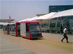 愛知といえばトヨタ自動車のお膝元だから…なのかもしれないが、バスのような乗り物ばかりが目に付いた。会場内を環状運転しているグローバルトラムは、3両編成のバスだが、”人除け係”を前に従えて走っていることからわかる通り、あまりに遅く当然輸送力も小さい。