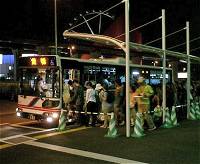閉場は22時となっているが、多くのパビリオンは21時で終了となる。したがってこのあたりの時間になると、来訪客がリニモに向かって一気に流れてくる。当然、あんなちっぽけなリニモではさばききれるはずもなく、ホームへの入場が制限がはじまる。 そうこうしている間に、臨時のバスが走っているということで、乗り場に向かってみると、バスが何台も次々とやってきては、乗客を運んでいるではないか。これこそが、交通機関に求められるフレキシブルさだと思う。 |