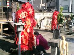 山門前には赤い札がぺたぺたと貼ってある像らしき物体…これが「赤紙仁王尊」と呼ばれるものらしく、具合の悪いところに赤い紙を貼ると、病気の身代わりになってくれるらしい。 |