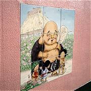 お隣青雲寺からすぐ。道路に沿った壁には、布袋尊様のアニメチックなイラストが描かれたタイルが貼られている。