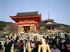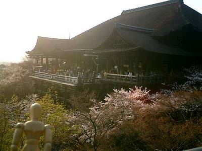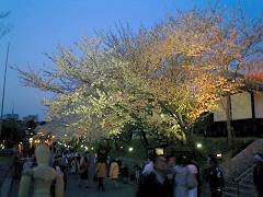ようやく清水道バス停に着いたのは、17時になろうかという時間だった。そこから清水寺までは数百メートル。スーツに革靴姿で万博記念公園〜京都御所と歩き回ってきたのでかなりくたびれた。平日にもかかわらず、たくさんの人たちでいっぱいだった。 ”清水の舞台”の前には、ちょうど桜が見頃を迎えていた。あたり一面という感じではなかったけれど、夕日に映えてとても美しかった。 かなりの逆光なので、写真になるときれいに写らない。 清水寺では、このあと、夜間公開をしているとのことだったが、同じところにいるのもちょっとつまんないので、どうしようかなぁ…と思いながら歩いていたら、この近くにある「高台寺」というところで、夜間特別拝観をやっているとポスターで見かけたので、行ってみることにした。 日も暮れてあたりはすっかり暗くなった。高台寺までの道の脇に咲く桜もライトアップされてきれいだった。で、やっぱり大勢の人たちで、受付には行列ができていた。