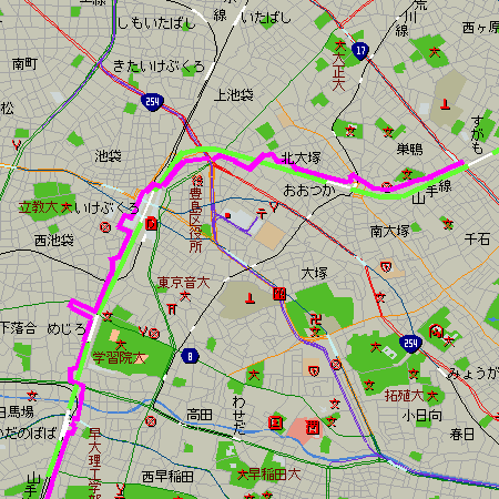 山手線、湘南新宿ライン(山手貨物線)を渡り、外側へ。また住宅地の中を進み、ちょっとの間山手線から離れてしまうが、大塚駅が近づいたところで、山手線と再会。