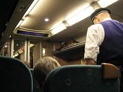 | 車掌さんは、もちろん日本と同じように、お客さんが切符をちゃんと持っているかどうかのチェックや扉の開閉などの業務をしている。ただ、日本と違ってるののは、すぐ隣のビュッフェで、コーヒーを作ったり、軽食の準備なんかもやっていたってこと。かなり忙しそうだった。 |