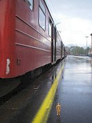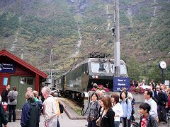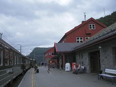 何があったのかよくわからないが、定刻より20分近く遅れて13時10分ごろに、ミュルダール駅に到着。乗り換える先のフロム鉄道は降りたホームの反対側に停車していて、乗り換えはとても簡単。しかも、フロム鉄道の出発時刻は13時27分なので、そんなに慌てることはなかったのだが、降りた客のほとんどがフロム鉄道への乗り換えだったので、まず席を確保しようという気持ちがあったのかもしれない。 発車まで間があるのに、ホームにはほとんど人がいなくなってしまった。