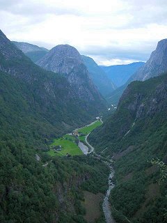しばらくすると、車窓からはおもちゃみたいな小さな家がいくつも見えてきた。ショスの滝から30分ほどかけて、終点のフロムに到着。 |