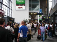 チェックインカウンターから伸びた行列は、蛇行するようにして通路を横切り、国鉄の乗車券売り場の前を通って、売店、軽食スタンドをぐるりと回って、さらに元のカウンターの方向に戻るように伸びていた。100m?200m?とにかくすごい行列だった。