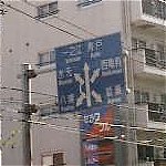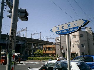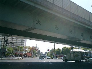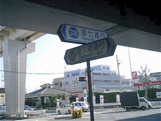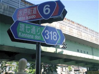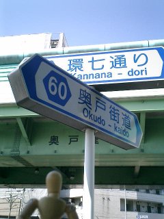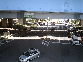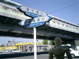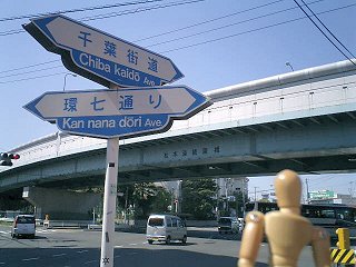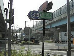 環七通りのの右側を走り続けているので、車道の案内板はちょっと見づらい。そんな見づらい案内板でも、ふと目に入ったのがこれ。矢印だらけで、一瞬どんな交差点になってるのだか、よくわからない。 で、実際にここに来てみたら、普通の十字路の交差点の上を、斜めに環七通りが陸橋で横切っているという状態だった(写真上参照)。 |