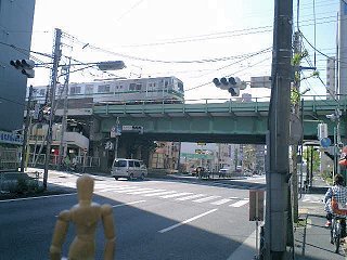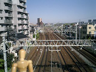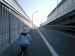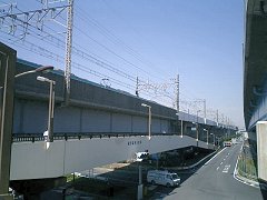 これまでは、車道と並行してきちんと自転車が走れる歩道があったのに、総武線を越えるこの陸橋には、それがなかった。歩行者用の階段があったので、仕方がなくその階段を使おうとしたところで、その場にいたおじいさんが、向こう側に行くのならば、ほんの少し回り道すればいいことを教えてくれた。 総武線の線路を越える前に、貨物線の線路を越えなければならず、ちょっとの間、環七通りから外れて走る。 |