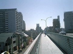 ![]() ![]() 陸橋のさらに上に、またぐ真新しい橋があった。 もうすぐ開業する新交通「日暮里・舎人ライナー」だ。もう車両もできているというのに、開業は平成19年度末とちょっと先だ。 |