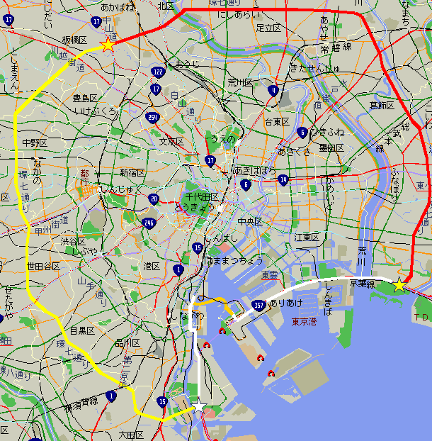 その後、国道16号線をママチャリで回った、たいこんでろが さんも、環七一周挑戦され無事成功しました。そのときに撮ったのが、この環七通り起点の看板。 看板は、こんなところにあったんですね…。 ありがとうございました。 |