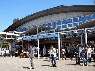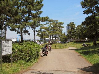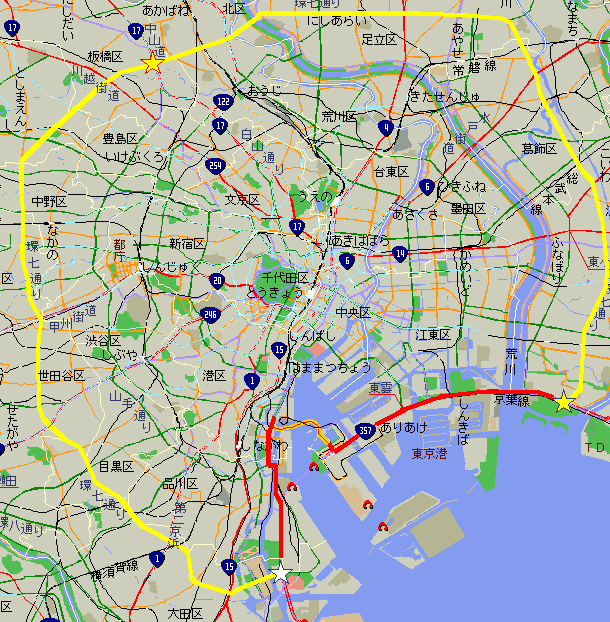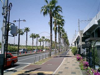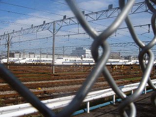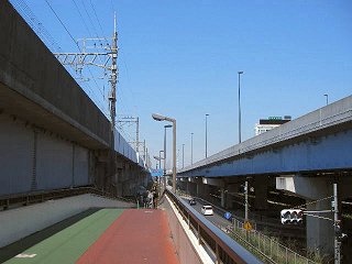 一路、環七通り起点へ 地図によれば、環七通り起点の「環七大井ふ頭」まで6〜7km程度。まずは東京モノレールに沿って、海岸通りを走る。しばらくすると、お台場まで来る時に利用した東京湾岸道路(国道357号線)が再び登場。ちなみに、東京湾岸道路の方はお台場から東京港トンネルを経由して対岸まで渡ってきている。車だったら、あっという間の距離。 20分ほど走ると、左手に新幹線の車両基地が見えてきた。環七通り起点まではあとちょっとだ。 |