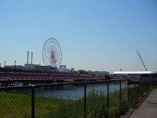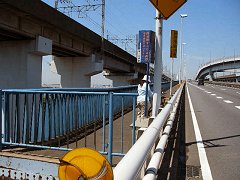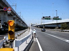 とりあえず車道を走る… 目の錯覚か橋の上を自転車で走る人の姿が見えた。 「そうだ、自転車でそのまま走っちゃえ」 ということで、車道をそのまま走ることにした。ただこの付近の車のスピードは高速道路並みで、すぐ脇をすり抜ける車は相当怖い。 それでも、なんとか進んでいくと、突然、歩道?が出現したのだ。 ただ、その歩道と車道との間には、かなりの高さの柵があった。自転車を歩道に入れるのは難儀な作業だった。よろけて車道に転ぼうものなら、間違いなく事故に巻き込まれる。 まさに命がけだった。 そして、なんとか無事、歩道らしき場所に自転車を入れて、ふたたびお台場に向けて出発。 |