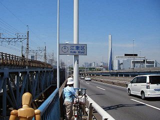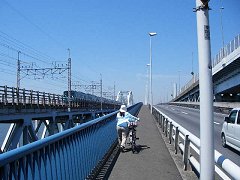そこには、あまりに広い荒川の流れがあった。しかし自転車で渡れる橋はなかった。ただ東京湾岸道路と京葉線の鉄橋を見上げるしかなかった。 もしこの橋ではなく別の橋を渡ろうとすると、相当上流までさかのぼらねばならず、それはこのチャレンジの事実上の失敗を意味することだった。 |