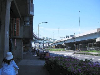 新木場駅付近 葛西臨海公園からずっと沿って走っていた京葉線が、ここ新木場駅を最後に、右にそれていくが、東京湾岸道路は、そのまままっすぐ進んでいく。 |