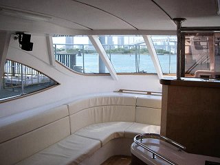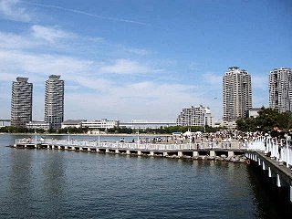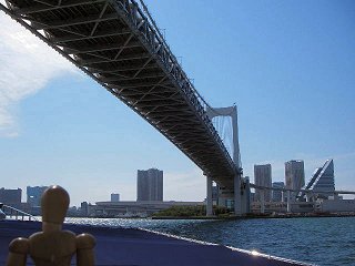 船内にいるのはもったいないと、外に出てデッキから、いままでいた桟橋を眺めつつ、お台場をあとにする。船は岸を離れて、レインボーブリッジの下をくぐるあたりで、かなりスピードを増す。 |