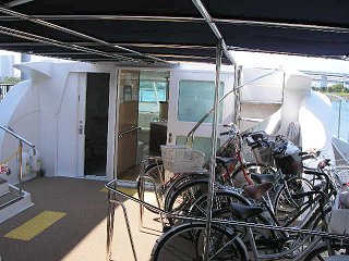 乗船 他の水上バスと比べるとかなり小さい船だったが、船そのものはとても新しく、船内のソファーは快適だった。自転車も最初から積めるような考慮がなされていた。 |