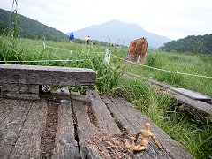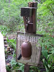 ![]() いよいよ尾瀬らしく… この地域でしか見られない動植物がたくさんある…らしいが、動物はそうめったに出てくるモノじゃないし、植物は見分けるポイントがわからないので、見落としがち。 今年は特にツキノワグマが多く出るとのことで、熊が出やすいところには、木道の脇に熊よけの鐘が置かれていた。 鐘と言っても、プロパンガスのキャップ?カバー?を代用したもので、そりを括り付けられているハンマーでたたく。するとこの音に気付いた熊が逃げるという仕掛け。 |