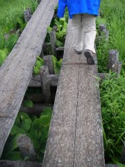 まだ湿原にはたどり着いていないが、途中から、尾瀬らしい木道が現れた。 木道はかなりしっかりしてとても歩きやすい。東京電力のCMで見たが、木道には作られた年を示す焼き印がしてある。中には今年作り替えられた木道もあった。さぞかしメンテナンスは大変だろう。 |