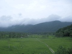 雨はバラバラと降っているものの、はるかかなたに、燧ヶ岳(ひうちがたけ)がよく見える。これくらいであれば、まだなんとか歩くのには支障はない。 ただ、花がとても綺麗な季節だというのに、花が全然見られなかった。 |