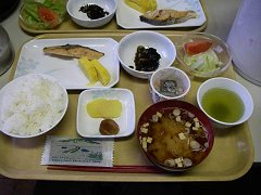 山小屋の朝は早い。朝食は6時から。 昨日に引き続き、朝からなかなかのボリューム。ご飯もお代わり自由だけど、さすがに朝は遠慮した。朝食のあと、前日に予約したおにぎりを受け取る。おにぎり2個とお新香で500円。 |