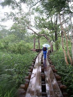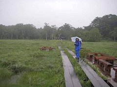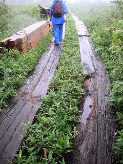 確かに、この雨では仕方がないとは思う。 けれど、どうしても解せないことがあった。それは、ぬかるんでいる場所の多くが、最初からこうなっているのではなく、もともと木道があったのに、それが撤去され、撤去された木道が脇に山積みになっているということだった。 山積みになった木道は、これまで見てきた木道と比べても、決して悪い状態ではなく、むしろまだまだ十分に使えるような感じだったのだ。 その結果、場所によっては、脇に積まれた木道を頼りに歩くことになり、バランスがとりづらく、かなり危ない状態だった。 |