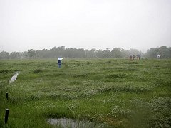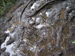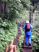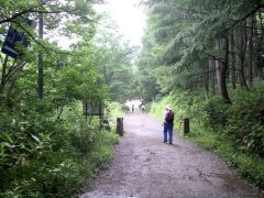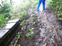泥道地獄…歩いていると、反対からやってくる人たちの靴が、泥だらけなのが気になった。一人や二人でなく、全員が泥だらけなのだ。 すると、木道でない部分がひどくぬかるんでいる場所に出くわした。 しかもそれが何カ所もあって、とても普通に進んでいけるような感じではなかった。場所によっては、泥がかなりの厚さになっていて、ずぶずぶと足が取られた。 |