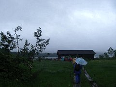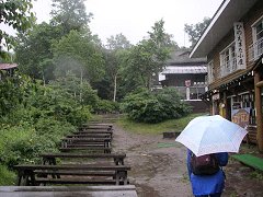 三平下到着(尾瀬沼休憩所)かなり久しぶりに休憩できる場所に着いた。ありがたいことに、雨は止んでいるから、外のベンチに座ることもできそうだ。 ここで、東電小屋で手に入れたおにぎりを食べることにする。靴の中に入った水が気持ち悪い。 |