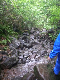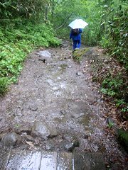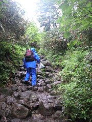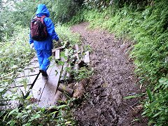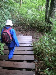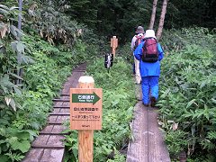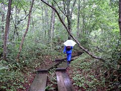 突然、木道が終わってしまった。 初めのうちは、そんなに大変ではなかったし、一部で、木道が復活するところもあったが、それもだんだんととぎれとぎれになってきた。 木道が途切れた場所では、登山道というより、自然にできた沢を登っていくという感じのところもあり、滑らないようにかなり気をつけなければならないところもあった。 |