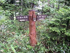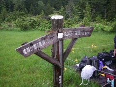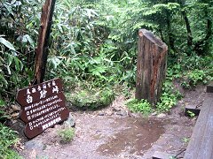 白砂峠 疲れがピークに達してきたところで、9時59分「白砂峠」という文字を見つける。 時間的にはある程度進んできたという認識はあったものの、このときは、あとどれくらいで沼尻に着くのかわからなかったために、大した励みにはならなかった。 雨のせいで詳しくガイドブックを見ることができなかったという理由もある。 |