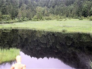 池塘の水深が深いせいか、水面が黒っぽい。大湿原の中にある池塘とは、違った雰囲気でじっと見ているとなんだか吸い込まれそうな感じになる。 |