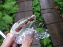 なんだか、修行みたいな感じになってきた。 休憩所で買ったまんじゅう(150円)を食べる。 |