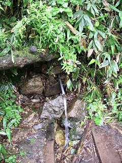 尾瀬沼西岸と比べたら、とても歩きやすい。 ひたすら下り。階段、坂、階段…とどんどん降りていく。登るよりは楽なのかもしれないけど、だんだん膝が痛くなる。 途中で水が湧き出しているところがあって、ここでも、また水を補給。 |