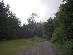 多少、森のおかげで雨が直接当たらないけれど、雨のために歩きにくくい。これまで同様に、淡々と歩いていく。 ちょっとした文字や標識があるだけでも励みになるが、出発してから0.6kmという文字(尾瀬沼林道分岐)を見ると、思ったより進んでないなとがっかりする。実際出発してから10分しか経ってなかった。 |