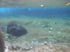 試しに白糸の滝の滝壺にカメラを入れてみる。かなり冷たい。雨にもかかわらず、水はきれいだが、流れが速いために、動植物の姿は見えない。