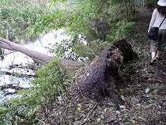 白糸の滝もそうだったが、ここでも、木が根本から倒れているのを何カ所も見つけた。遊歩道が完全に浮き上がっているところもあったが、特にこれといった規制もなく、そのすぐ脇を注意深く歩く。