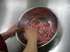 セットした羊腸に肉を詰めていく |