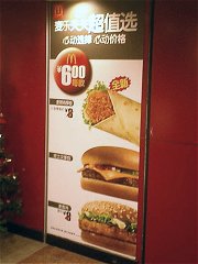 市内のあちこちにマクドナルドがある。 漢字ではこんな←ような牛蒡(ごぼう)みたいな文字を使う。店には入らなかったが、売っているものは日本と大して変わらないような感じだった。 日本でも100円で買える商品がいくつかあるが、こちら上海でも同じようなコンセプトの商品があった。6元=96円ということで、これまた日本とほぼ同じような値段。 中国にしては、若干高めの値段設定かもしれない。